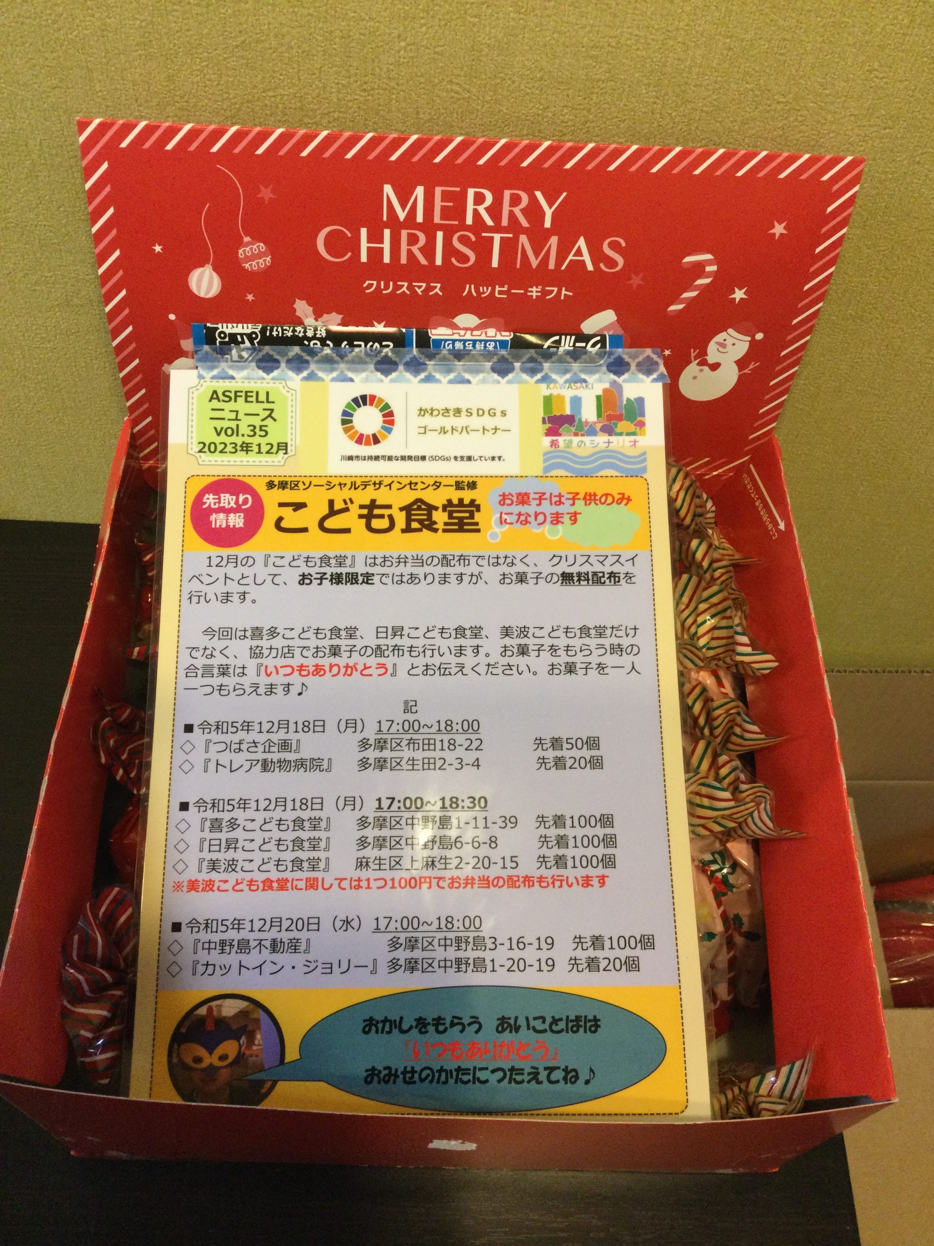 こども食堂 2024.11.12 お知らせ 弊社の事務所の近くで活動されているこども食堂に微力ながらご支援をさせていただいています。 団体を設立されて5年余り。「繋がり」を意識し、単に食事の提供だけでなく、地域との繋がりを持つことにより、コミュニケーションの場を提供し孤立の防止に努める活動をされています。 昨年は12月のクリスマス前にお菓子の無料配布を行いました。 これからも活動に参加していきたいと思います。 (昨年のお菓子配布の様子)